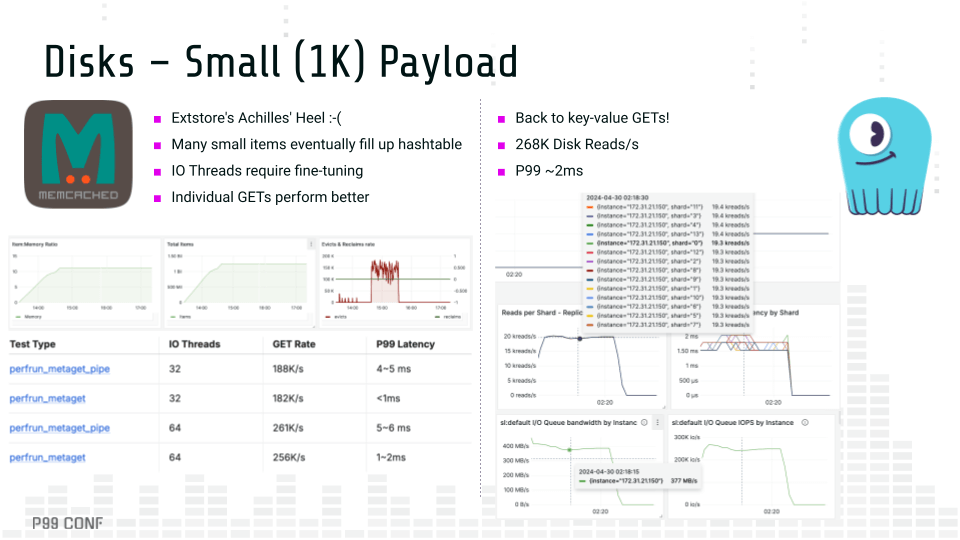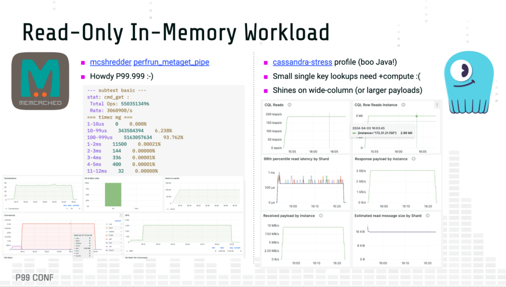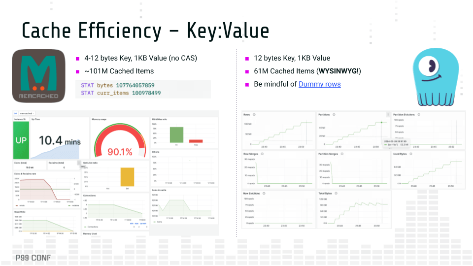 Lessons learned comparing Memcached with ScyllaDB Although caches and databases are different animals, databases have always cached data and caches started to use disks, extending beyond RAM. If an in-memory cache can rely on flash storage, can a persistent database also function as a cache? And how far can you reasonably push each beyond its original intent, given the power and constraints of its underlying architecture? A little while ago, I joined forces with Memcached maintainer Alan Kasindorf (a.k.a. dormando) to explore these questions. The collaboration began with the goal of an “apples to oranges” benchmark comparing ScyllaDB with Memcached, which is covered in the article “We Compared ScyllaDB and Memcached and… We Lost?” A few months later, we were pleasantly surprised that the stars aligned for P99 CONF. At the last minute, Kasindorf was able to join us to chat about the project – specifically, what it all means for developers with performance-sensitive use cases. Note: P99 CONF is a highly technical conference on performance and low-latency engineering. We just wrapped P99 CONF 2025, and you can watch the core sessions on-demand. Watch on demand Cache Efficiency Which data store uses memory more efficiently? To test it, we ran a simple key-value workload on both systems. The results: Memcached cached 101 million items before evictions began ScyllaDB cached only 61 million items before evictions Cache efficiency comparison What’s behind the difference? ScyllaDB also has its own LRU (Least Recently Used) cache, bypassing the Linux cache. But unlike Memcached, ScyllaDB supports a wide-column data representation: A single key may contain many rows. This, along with additional protocol overhead, causes a single write in ScyllaDB to consume more space than a write in Memcached. Drilling down into the differences, Memcached has very little per-item overhead. In the example from the image above, each stored item consumes either 48 or 56 bytes, depending on whether compare and swap (CAS) is enabled. In contrast, ScyllaDB has to handle a lot more (it’s a persistent database after all!). It needs to allocate space for its memtables, Bloom filters and SSTable summaries so it can efficiently retrieve data from disk when a cache miss occurs. On top of that, ScyllaDB supports a much richer data model(wide column). Another notable architectural difference stands out in the performance front: Memcached is optimized for pipelined requests (think batching, as in DynamoDB’s BatchGetItem), considerably reducing the number of roundtrips over the network to retrieve several keys. ScyllaDB is optimized for single (and contiguous) key retrievals under a wide-column representation. Read-only in-memory efficiency comparison Following each system’s ideal data model, both ScyllaDB and Memcached managed to saturate the available network throughput, servicing around 3 million rows/s while sustaining below single-digit millisecond P99 latencies. Disks and IO Efficiency Next, the focus shifted to disks. We measured performance under different payload sizes, as well as how efficiently each of the systems could maximize the underlying storage. With Extstore and small (1K) payloads, Memcached stored about 11 times more items (compared to its in-memory workload) before evictions started to kick in, leaving a significant portion of free available disk space. This happens because, in addition to the regular per-key overhead, Memcached stores an additional 12 bytes per item in RAM as a pointer to storage. As RAM gets depleted, Extstore is no longer effective and users will no longer observe savings beyond that point. Disk performance with small payloads comparison For the actual performance tests, we stressed Extstore against item sizes of 1KB and 8KB. The table below summarizes the results: Test Type Payload Size I/O Threads GET Rate P99 Latency perfrun_metaget_pipe 1KB 32 188K/s 4~5 ms perfrun_metaget 1KB 32 182K/s <1ms perfrun_metaget_pipe 1KB 64 261K/s 5~6 ms perfrun_metaget 1KB 64 256K/s 1~2ms perfrun_metaget_pipe 8KB 16 92K/s 5~6 ms perfrun_metaget 8KB 16 90K/s <1ms perfrun_metaget_pipe 8KB 32 110K/s 3~4 ms perfrun_metaget 8KB 32 105K/s <1ms We populated ScyllaDB with the same number of items as we used for Memcached. ScyllaDB actually achieved higher throughput – and just slightly higher latency – than Extstore. I’m pretty sure that if the throughput had been reduced, the latency would have been lower. But even with no tuning, the performance is quite comparable. This is summarized below: Test Type Payload Size GET Rate Server-Side P99 Client-Side P99 1KB Read 1KB 268.8K/s 2ms 2.4ms 8KB Read 8KB 156.8K/s 1.54ms 1.9ms A few notable points from these tests: Extstore required considerable tuning to fully saturate flash storage I/O. Due to Memcached’s architecture, smaller payloads are unable to fully use the available disk space, providing smaller gains compared to ScyllaDB. ScyllaDB rates were overall higher than Memcached in a key-value orientation, especially under higher payload sizes. Latencies were better than pipelined requests, but slightly higher than individual GETs in Memcached. I/O Access Methods Discussion These disk-focused tests unsurprisingly sparked a discussion about the different I/O access methods used by ScyllaDB vs. Memcached/Extstore. I explained that ScyllaDB uses asynchronous direct I/O. For an extensive discussion of this, read this blog post by ScyllaDB CTO and cofounder Avi Kivity. Here’s the short version: ScyllaDB is a persistent database. When people adopt a database, they rightfully expect that it will persist their data. So, direct I/O is a deliberate choice. It bypasses the kernel page cache, giving ScyllaDB full control over disk operations. This is critical for things like compactions, write-ahead logs and efficiently reading data off disk. A user-space I/O scheduler is also involved. It lives in the middle and decides which operation gets how mu