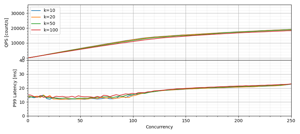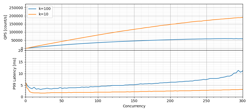 Results from a benchmark using the yandex-deep_1b dataset, which contains 1 billion vectors of 96 dimensions As AI-driven applications move from experimentation into real-time production systems, the expectations placed on vector similarity search continue to rise dramatically. Teams now need to support billion-scale datasets, high concurrency, strict p99 latency budgets, and a level of operational simplicity that reduces architectural overhead rather than adding to it. ScyllaDB Vector Search was built with these constraints in mind. It offers a unified engine for storing structured data alongside unstructured embeddings, and it achieves performance that pushes the boundaries of what a managed database system can deliver at scale. The results of our recent high scale 1-billion-vector benchmark show that ScyllaDB demonstrates both ultra-low latency and highly predictable behaviour under load. Architecture at a Glance To achieve low-single-millisecond performance across massive vector sets, ScyllaDB adopts an architecture that separates the storage and indexing responsibilities while keeping the system unified from the user’s perspective. The ScyllaDB nodes store both the structured attributes and the vector embeddings in the same distributed table. Meanwhile, a dedicated Vector Store service – implemented in Rust and powered by the USearch engine optimized to support ScyllaDB’s predictable single-digit millisecond latencies – consumes updates from ScyllaDB via CDC and builds approximate-nearest-neighbour (ANN) indexes in memory. Queries are issued to the database using a familiar CQL expression such as: SELECT … ORDER BY vector_column ANN_OF ? LIMIT k; They are then internally routed to the Vector Store, which performs the similarity search and returns the candidate rows. This design allows each layer to scale independently, optimising for its own workload characteristics and eliminating resource interference. Benchmarking 1 Billion Vectors To evaluate real-world performance, ScyllaDB ran a rigorous benchmark using the publicly available yandex-deep_1b dataset, which contains 1 billion vectors of 96 dimensions. The setup consisted of six nodes: three ScyllaDB nodes running on i4i.16xlarge instances, each equipped with 64 vCPUs, and three Vector Store nodes running on r7i.48xlarge instances, each with 192 vCPUs. This hardware configuration reflects realistic production deployments where the database and vector indexing tiers are provisioned with different resource profiles. The results focus on two usage scenarios with distinct accuracy and latency goals (detailed in the following sections). A full architectural deep-dive, including diagrams, performance trade-offs, and extended benchmark results for higher-dimension datasets, can be found in the technical blog post Building a Low-Latency Vector Search Engine for ScyllaDB. These additional results follow the same pattern seen in the 96-dimensional tests: exceptionally low latency, high throughput, and stability across a wide range of concurrent load profiles. Scenario #1 — Ultra-Low Latency with Moderate Recall The first scenario was designed for workloads such as recommendation engines and real-time personalisation systems, where the primary objective is extremely low latency and the recall can be moderately relaxed. We used index parameters m = 16, ef-construction = 128, ef-search = 64 and Euclidean distance. At approximately 70% recall and with 30 concurrent searches, the system maintained a p99 latency of only 1.7 milliseconds and a p50 of just 1.2 milliseconds, while sustaining 25,000 queries per second. When expanding the throughput window (still keeping p99 latency below 10 milliseconds), the cluster reached 60,000 QPS for k = 100 with a p50 latency of 4.5 milliseconds, and 252,000 QPS for k = 10 with a p50 latency of 2.2 milliseconds. Importantly, utilizing ScyllaDB’s predictable performance, this throughput scales linearly: adding more Vector Store nodes directly increases the achievable QPS without compromising latency or recall. Latency and throughput depending on the concurrency level for recall equal to 70%. Scenario #2 — High Recall with Slightly Higher Latency The second scenario targets systems that require near-perfect recall, including high-fidelity semantic search and retrieval-augmented generation pipelines. Here, the index parameters were significantly increased to m = 64, ef-construction = 512, and ef-search = 512. This configuration raises compute requirements but dramatically improves recall. With 50 concurrent searches and recall approaching 98%, ScyllaDB kept p99 latency below 12 milliseconds and p50 around 8 milliseconds while delivering 6,500 QPS. When shifting the focus to maximum sustained throughput while keeping p99 latency under 20 milliseconds and p50 under 10 milliseconds, the system achieved 16,600 QPS. Even under these settings, latency remained notably stable across values of k from 10 to 100, demonstrating predictable behaviour in environments where query limits vary dynamically. Latency and throughput depending on the concurrency level for recall equal to 98%. Detailed results The table below presents the summary of the results for some representative concurrency levels. Run 1 Run 2 Run 3 m 16 16 64 efconstruct 128 128 512 efsearch 64 64 512 metric Euclidean Euclidean Euclidean upload 3.5 h 3.5 h 3.5 h build 4.5 h 4.5 h 24.4 h p50 [ms] 2.2 1.7 8.2 p99 [ms] 9.9 4 12.3 qps 252,799 225,891 10,206 Unified Vector Search Without the Complexity A big advantage of integrating Vector Search with ScyllaDB is that it delivers substantial performance and networking cost advantages. The vector store resides close to the data with just a single network hop between metadata and embedding storage in the same availability zone. This locality, combined with ScyllaDB’s shard-per-core execution model, allows the system to provide real-time latency and massive throughput even under heavy load. The resul